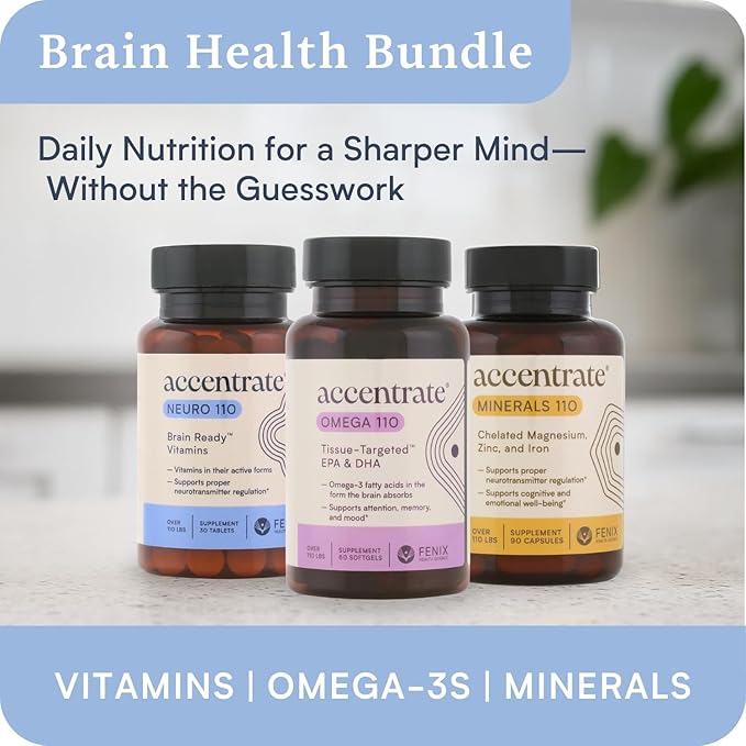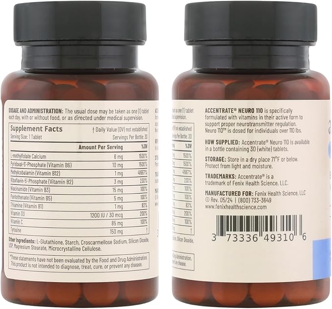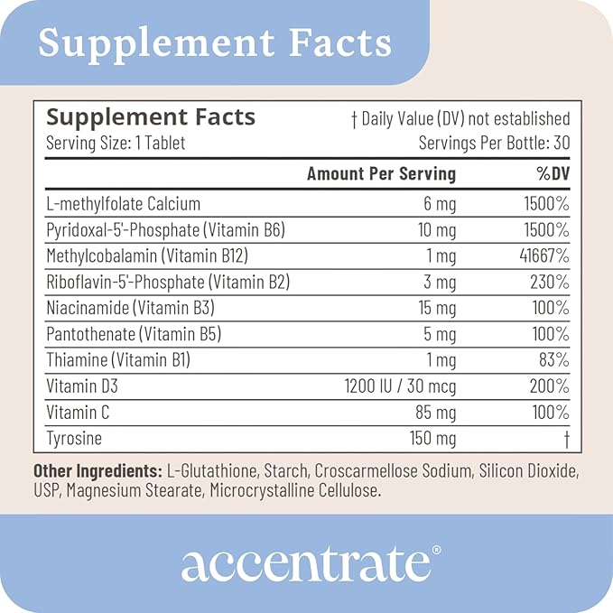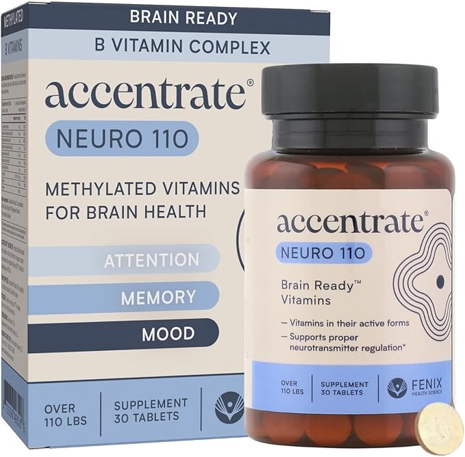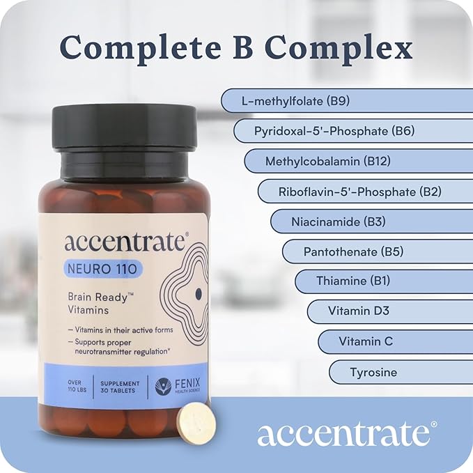 Accentrate Neuro 110- Complete Vitamin B Complex | Methylated Multivitamin w/L-Methylfolate (5-MTHF) Methylcobalamin (B12) Pyridoxal-5'-Phosphate (P5P) | Brain Health | MTHFR Supplement | 30 Tablets