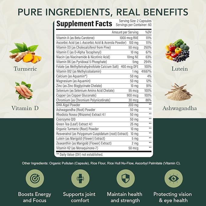 - š± Targeted 40+ Nutrients for Energy, Heart & Brain Health ā Packed with essential nutrients for vitamins for women over 60 plus and mens multi vitamins over 60, including DHA Algal Powder, CoQ10, Resveratrol, and Green Tea Extract to support cardiovascular health, cognitive function, and longevity.
