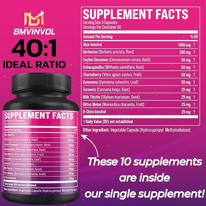 BMVINVOL Inositol Supplement - Myo-Inositol and D-Chiro Inositol Ideal 40:1 Ratio - Plus Berberine, Cinnamon, Ashwagandha + 5 More - 150 Capsules