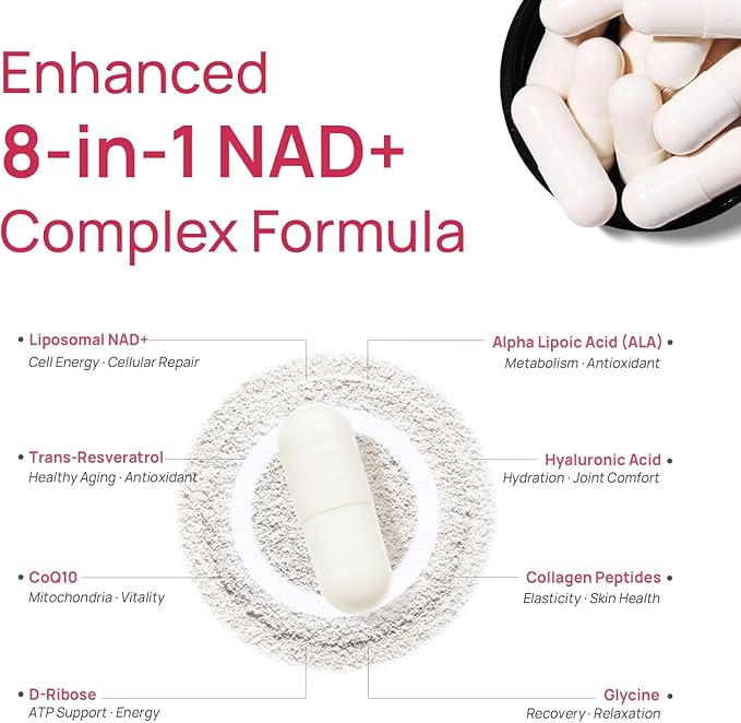 - POWERFUL ANTI-AGING SUPPORT – The ultimate anti-aging formula, specially designed for women, now featuringβ-NAD+, Trans-Resveratrol, Coenzyme Q10, D-Ribose, Alpha Lipoic Acid, Glycine, Hyaluronic Acid, and Hydrolyzed Collagen Peptide in every serving. Engineered for direct cellular absorption, it supports visible improvements in reducing skin aging while also promoting cellular renewal and repair. Additionally, this formula aids in DNA health, muscle recovery, and cognitive function, helping to enhance youthful vitality and overall well-being.