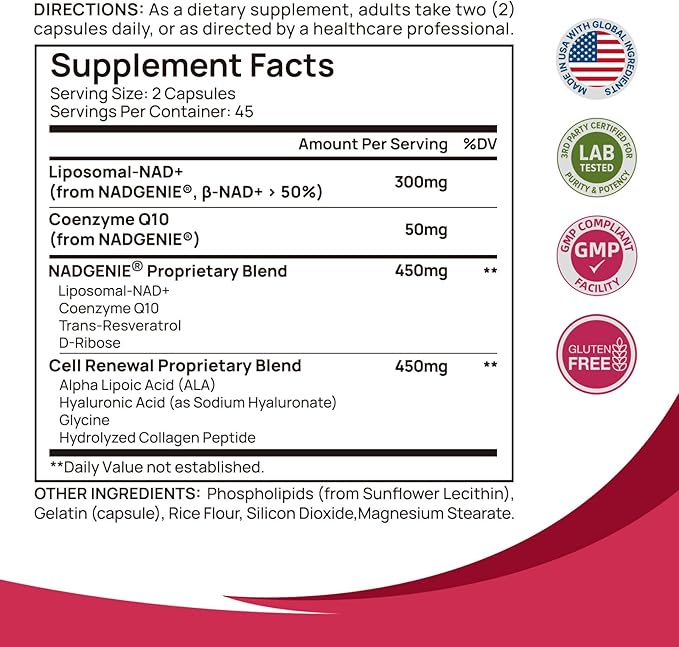- THE FACT – WITHOUT NAD+, CELLS CAN'T FUNCTION OPTIMALLY. Our bodies naturally decrease in NAD+, with a 60% - 65% decline between ages 30 and 75. Effects of metabolic stress and time accelerate aging and lead to various health concerns. Unlike precursors like NR or NMN, β-NAD+ is directly absorbed by cells without requiring conversion, ensuring immediate and effective support. Consult with a healthcare provider to adjust dosage as needed.