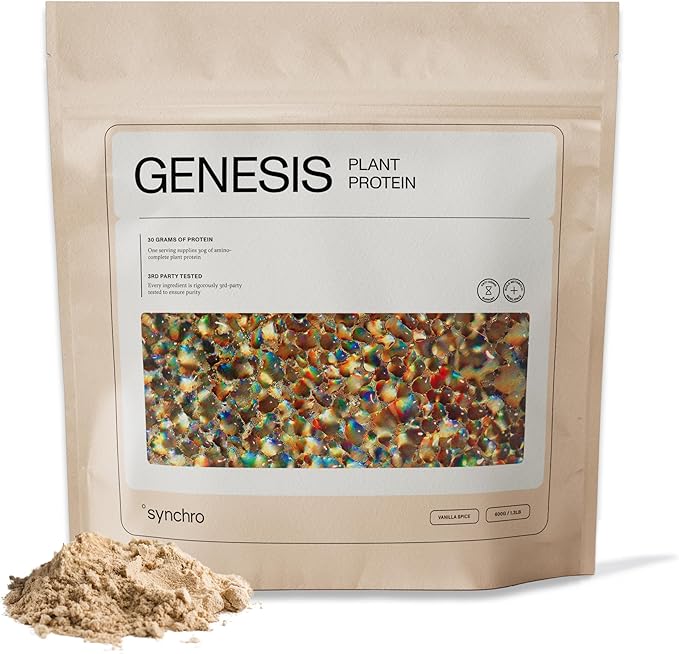 - COMPLETE PROTEINS: The plant protein blend in Synchro Genesis is highly digestible and formulated to provide an ideal amino acid profile. One serving of Genesis contains 30g of amino-complete plant protein.