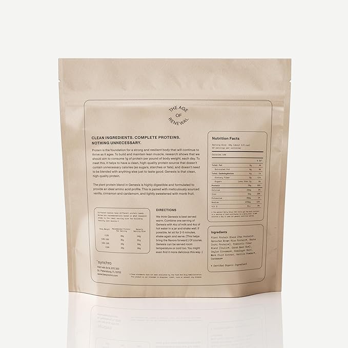 - CLEAN INGREDIENTS: Organic plant proteins, prebiotics, and organic single-origin spices, tastefully sweetened by monk fruit. Every ingredient in Synchro Genesis is meticulously sourced, supply chain verified and then rigorously 3rd party tested to ensure purity.