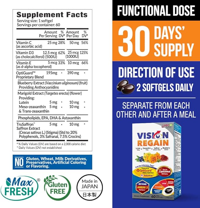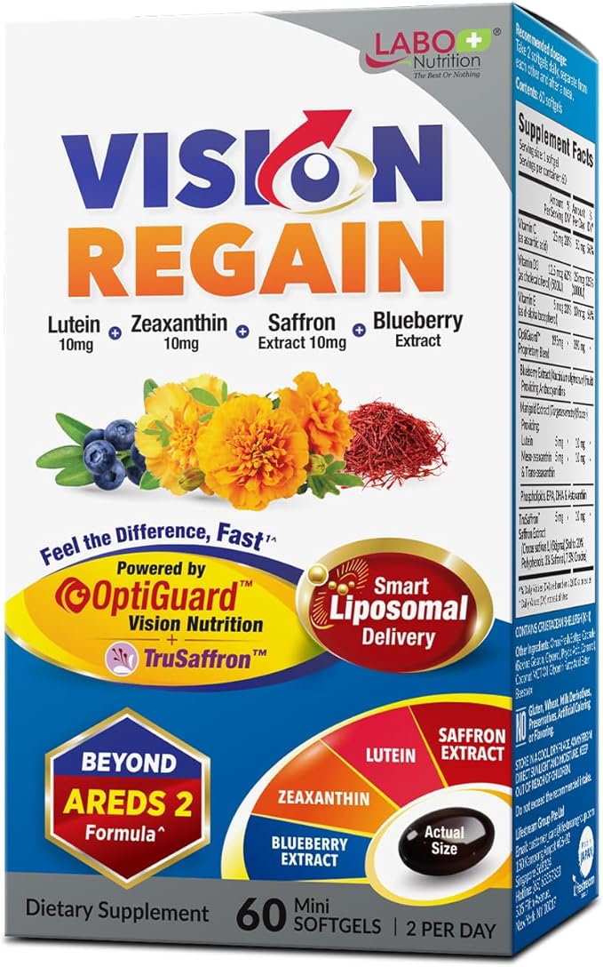 LABO Nutrition VisionREGAIN, Eye Vitamin Beyond AREDS 2 Formula with Lutein, Zeaxanthin, Saffron Extract, Blueberry for Macular and Retinal Health, Eye Fatigue, Night Vision Support 60 Counts