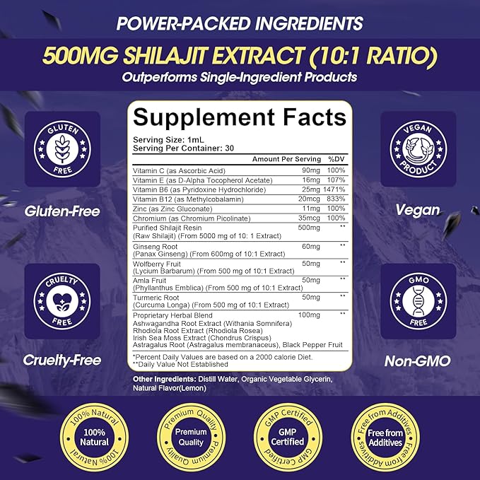 - Convenient Liquid Shilajit for Every Lifestyle: This Shilajit resin supplement comes in an easy-to-use dropper format. Take it directly or mix into water or your favorite beverage. Perfect for anyone looking for a high-quality liquid vitamin and mineral supplement.