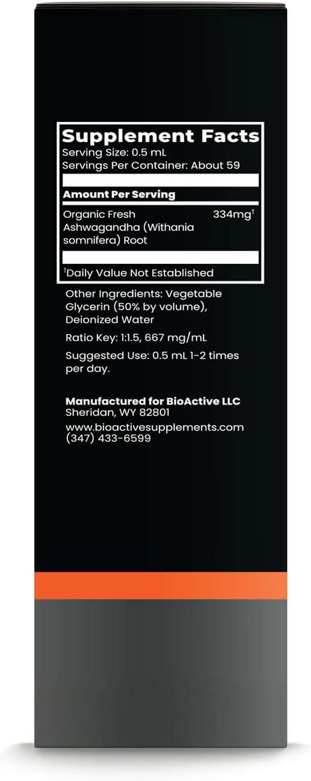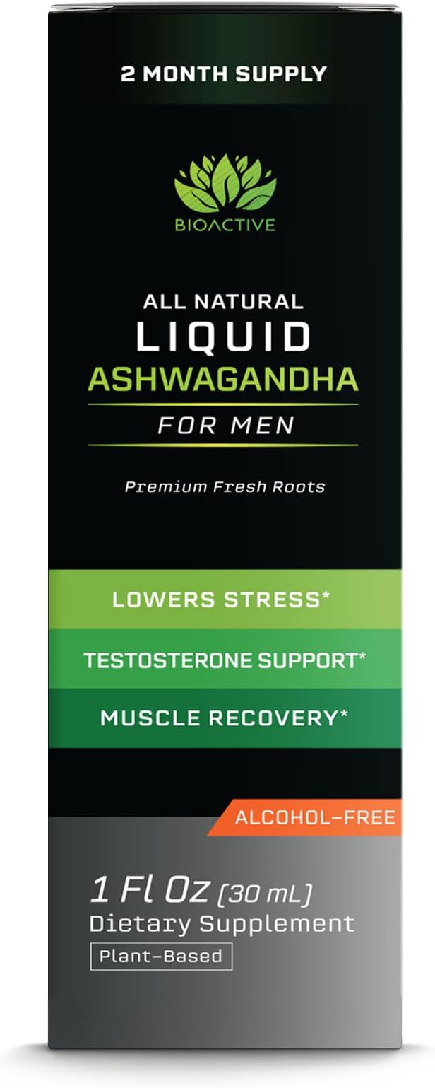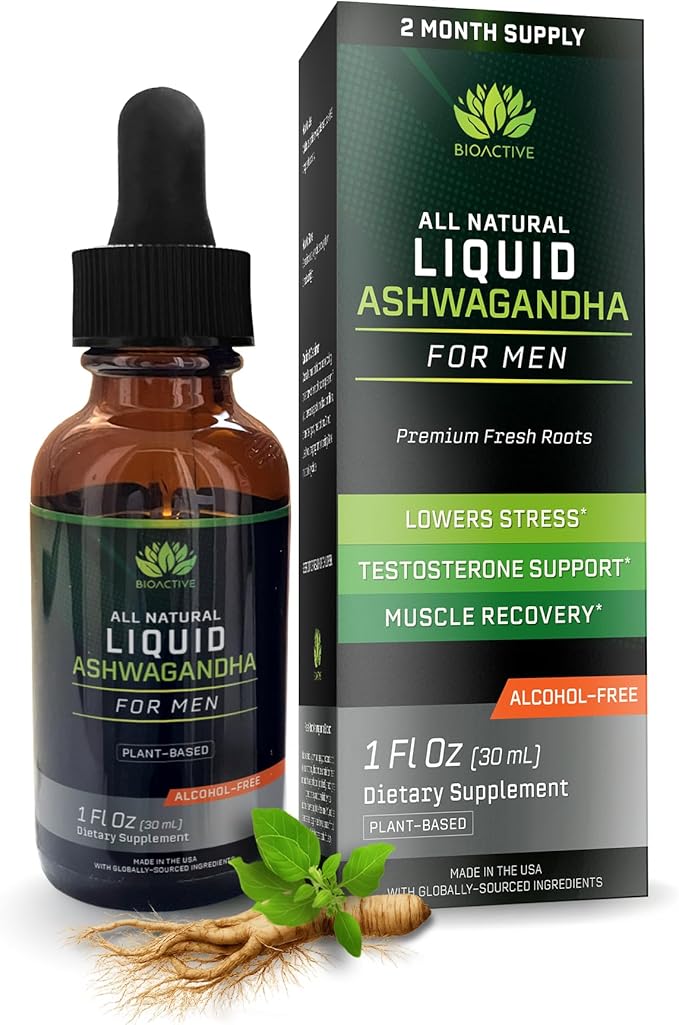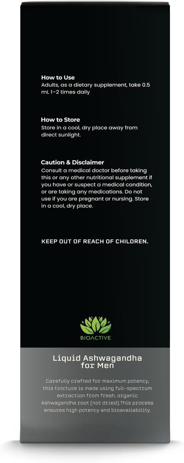 BIOACTIVE Liquid Ashwagandha Drops - Testosterone Health Supplement* - Adaptogen for Stress Support, Men’s Wellness - Organic, Herbal, Gluten Free, Non-GMO, 59 Servings (1 Oz, Unflavored)
