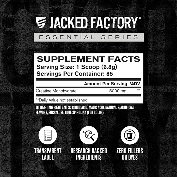 - Pure Creatine Monohydrate Powder: Jacked Factory Creatine Monohydrate powder features 5000mg of flavored, pure creatine monohydrate in every scoop. Our creatine powder mixes easily in virtually any liquid and can be stacked with your favorite fitness supplements, such as pre-workout and BCAAs.