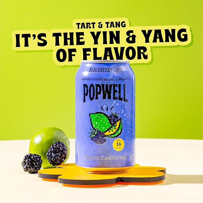 Popwell Blackberry Lime Better-For-You Prebiotic Soda, with 6g Fiber, 1g Sugar, Vitamins and Immunity Support, 12 fl oz Cans (pack of 12)