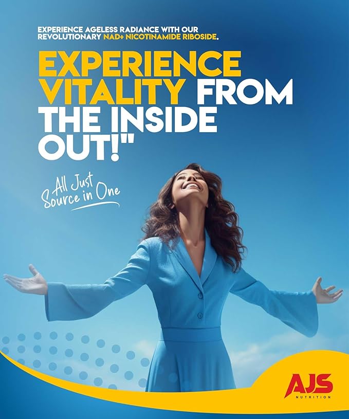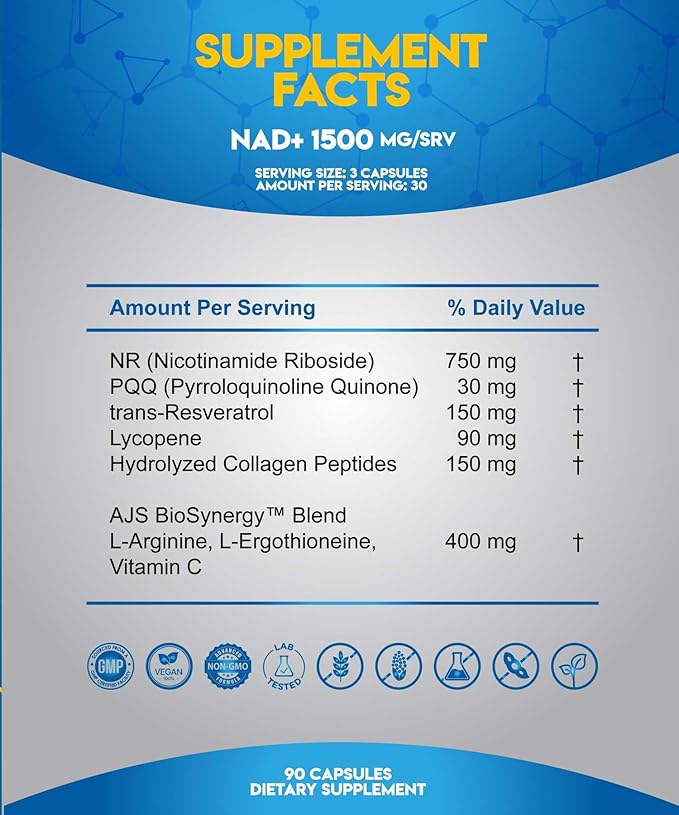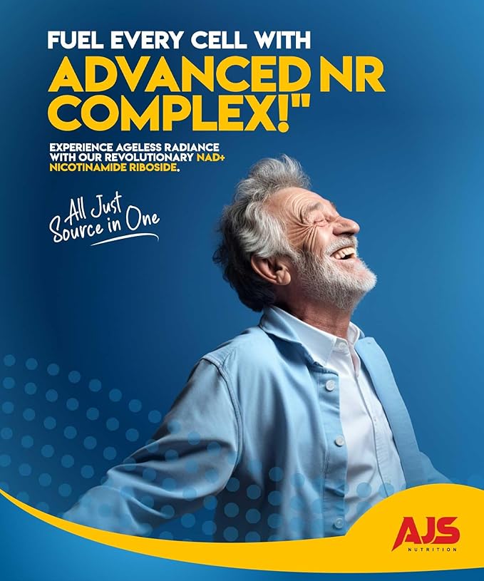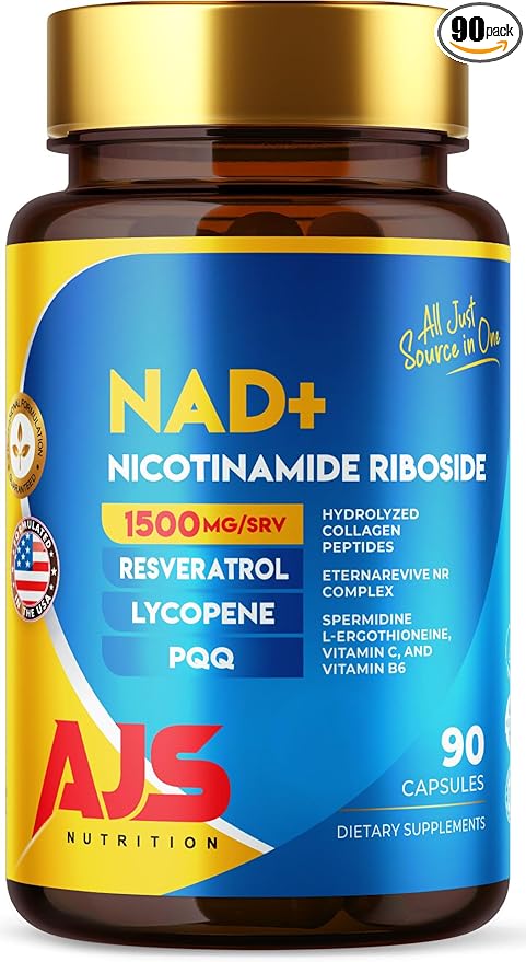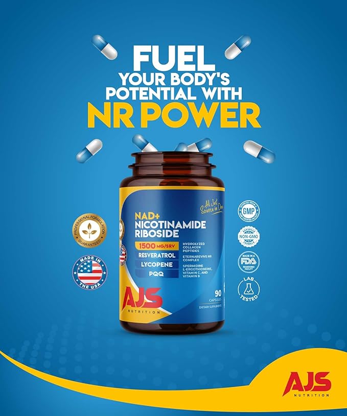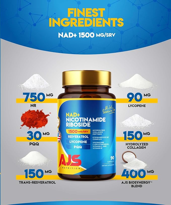 AJS NAD+ Cellular Energy – NR Supplement with PQQ, Resveratrol, Lycopene, Spermidine, L-Ergothioneine, and Collagen Peptides – 90 Capsules for Cellular Support