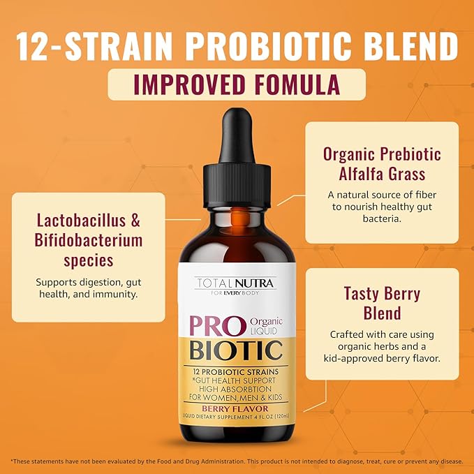 - THE LIQUID EDGE: Adult & Kid probiotic supplements should give you results – but many womens & mens probiotic supplements are a waste of time & money. Total Nutra Liquid Probiotics for women & men are formulated for fast, direct uptake in the gastrointestinal tract, with a 98% absorption rate. Quick & easy to take, our probiotic supplement eliminates the hassle of choking down chalky, hard-to-swallow pills or artificially sweetened gummies.
