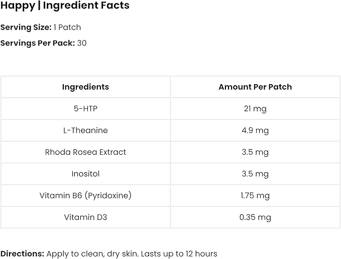 Happy Patch | 5-HTP, L-Theanine, Rhodiola, Inositol, B6, Vitamin D3 | 30 Patches