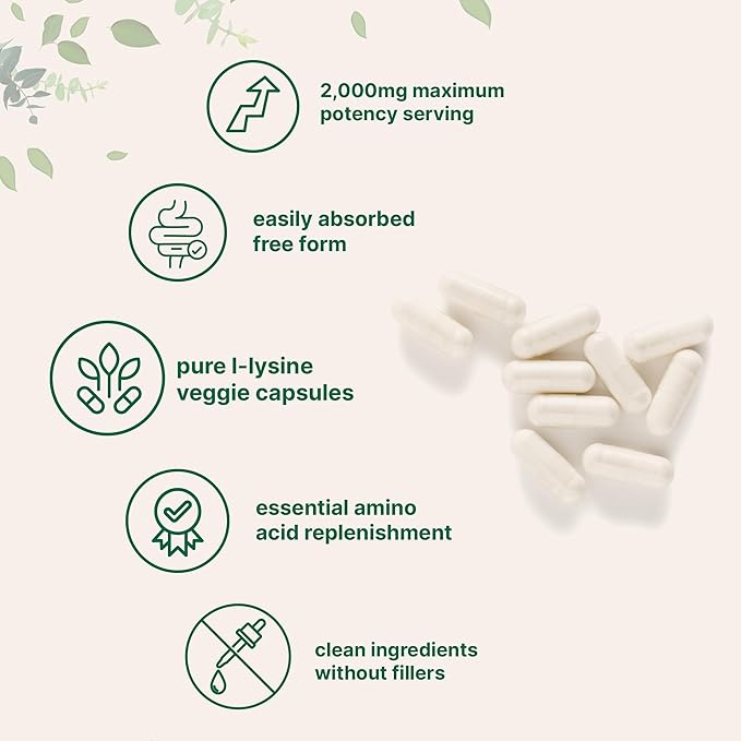 - Each bottle includes 300 natural veggie capsules, providing 2,000mg of maximum potency L-Lysine as L-Lysine Hydrochloride (HCl) per serving.