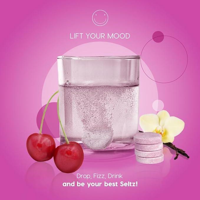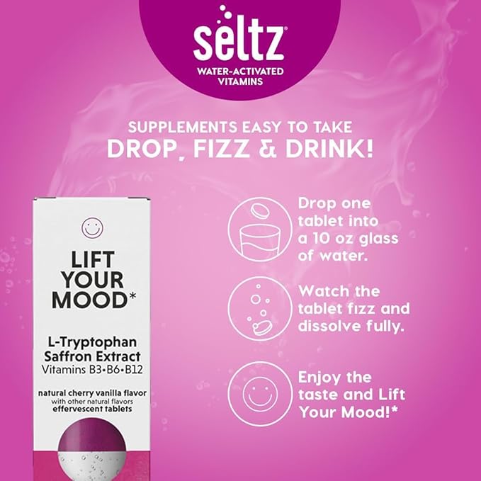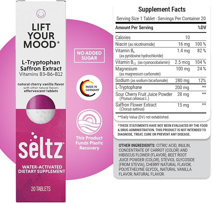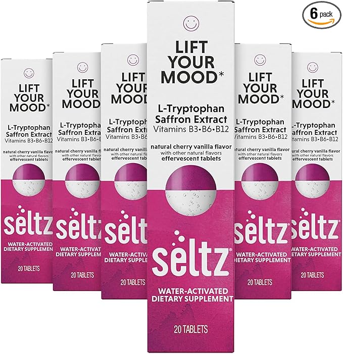 Seltz® Water-Activated Vitamins - Lift Your Mood with L-Tryptophan, Saffron Extract and Vitamins B3 B6 B12 – Natural Cherry Vanilla Flavor Dietary Supplement - 6 Packs x 20 Effervescent Tablets Each