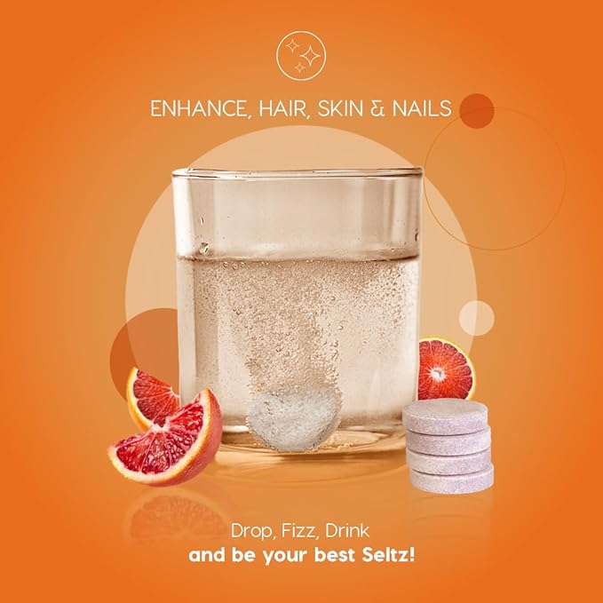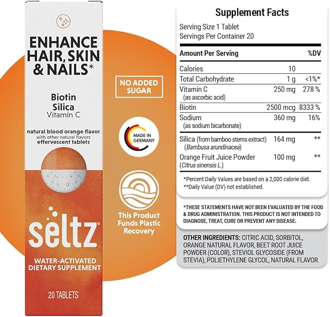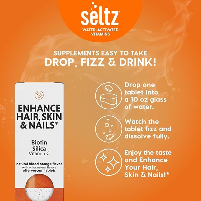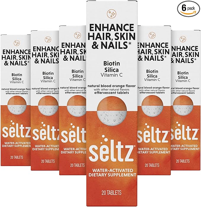 Seltz® Water-Activated Vitamins - Enhance Hair, Skin & Nails with Vitamin C, Silica, and Biotin – Natural Blood Orange Flavor Dietary Supplement - 6 Packs x 20 Effervescent Tablets Each