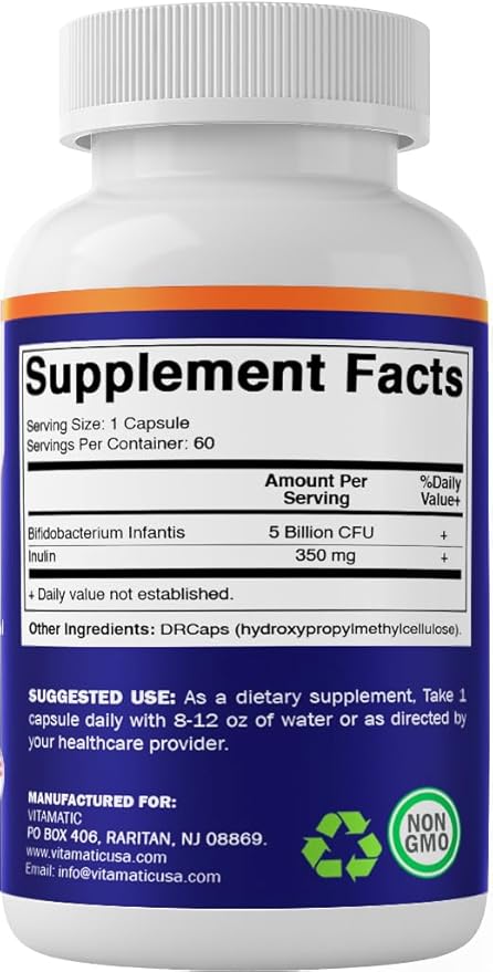 Vitamatic Bifidobacterium Infantis - 5 Billion per DR Capsule - 60 Count - Digestive Support - Made with Prebiotic Inulin Fiber