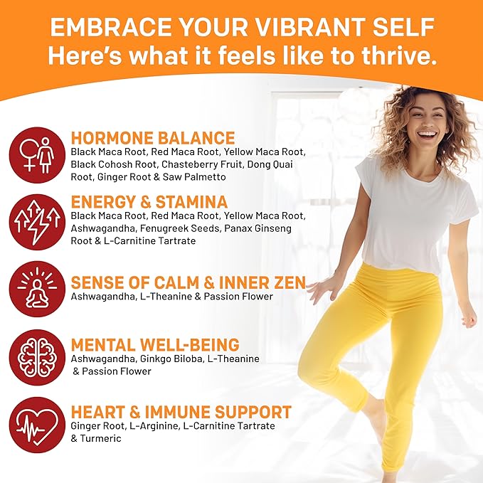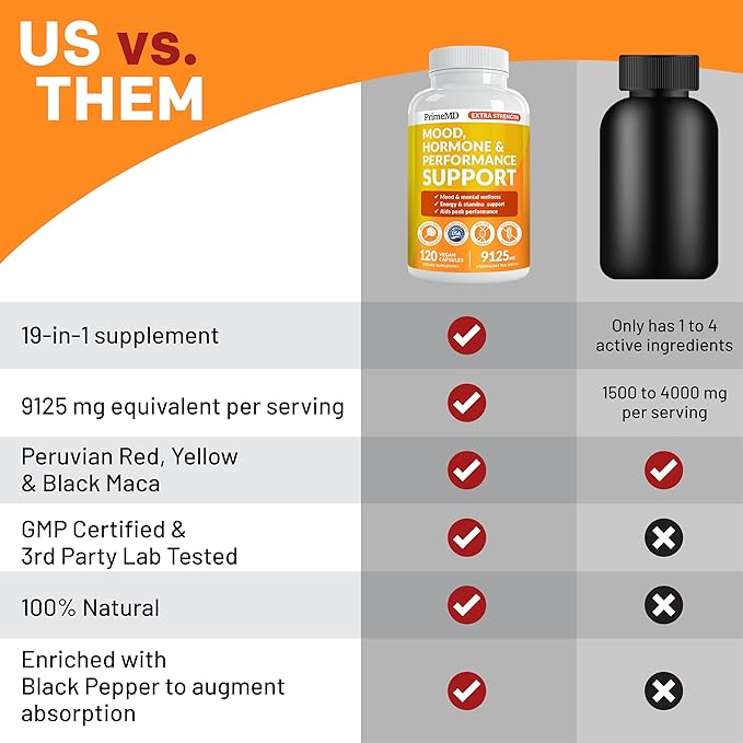 - What Are the Benefits? Boasting a robust 9,125 mg per serving, each maca capsule is a powerhouse of ingredients aimed at supporting hormone balance, testosterone, muscle, performance, heart, mood, and mental well-being. Our Peruvian Black Maca Root capsules for men and women are not only gluten-free and GMO-free but also undergo rigorous third-party testing for uncompromising quality assurance.