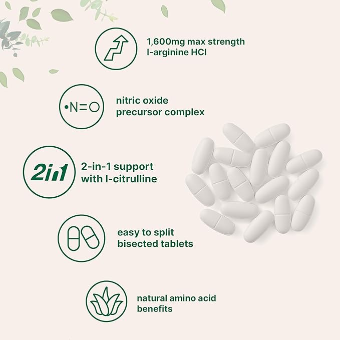 L-Arginine 1,600mg Nitric Oxide Supplement for Men with L-Citrulline, 240 Bisected Tablets | Nitric Oxide Precursor | Muscle, Energy, & Heart Support | Non-GMO, Gluten Free - 4 Month Supply