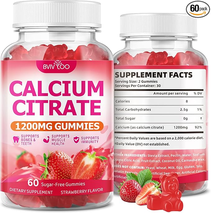 High Absorption Calcium Citrate Gummies 1200mg - Bone & Teeth Support for Adults & Kids, Vegan Sugar-Free Gummies, Strawberry Flavor, 60 Count