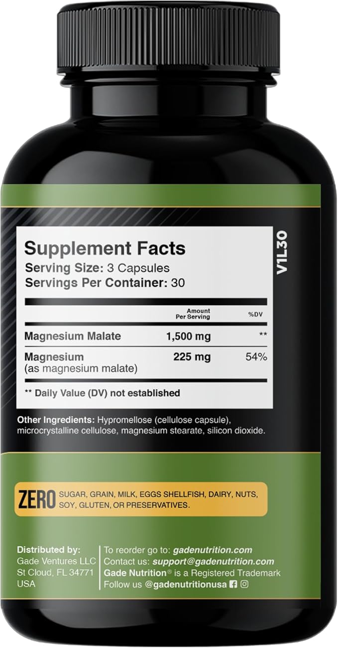 Gade Nutrition Magnesium Supplement as Magnesium Malate | Vegetable Capsules 1,500 mg Made with Calm Magnesium Powder | Magnesium Complex Made in USA