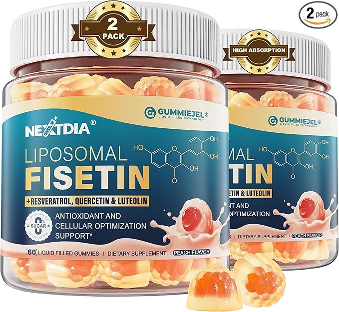 - LIPOSOMAL LIQUID-FILLED GUMMIES -- Fisetin, a natural flavonoid, supports cellular health but faces low bioavailability. Our liposomal fisetin formula solves this with 10X higher absorption. Enhanced with unique GummieJel Technology, the fisetin complex is encapsulated in the center, enhancing its stability and potency. The double-layer design with delivery system maximizes nutrient delivery to your cells. Black pepper extract further boosts bioavailability.