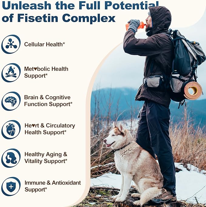 - THE CELLULAR REJUVENATION POWERHOUSE -- Fisetin, a powerful bioflavonoid polyphenol, acts as a "hero" for cellular health by targeting and clearing aging cells, allowing space for healthy tissue regeneration. By boosting glutathione levels and supporting mitochondrial function, our liposomal fisetin supplement enhances cellular repair and daily vitality. Each gummy delivers 200mg of 98% pure fisetin—a science-backed dose for cellular rejuvenation and vitality.