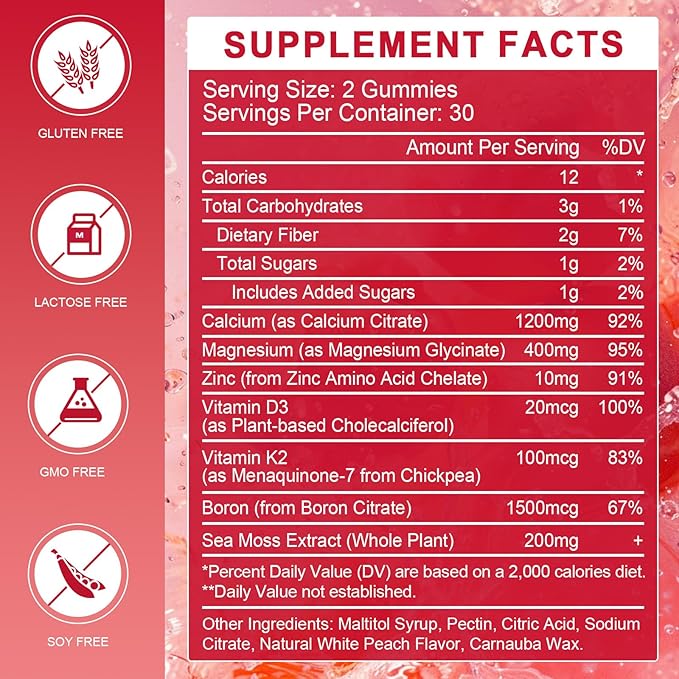 Calcium Citrate 1200mg Gummies with Vitamin D3, K2 - Chewable Calcium Magnesium Zinc d3 Supplement with Sea Moss Extract for Bone, Teeth, Immune Support for Women & Men, Peach Flavor-60 Gummies(3Pack)