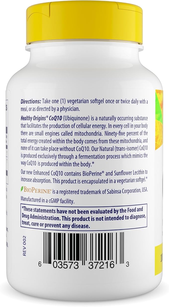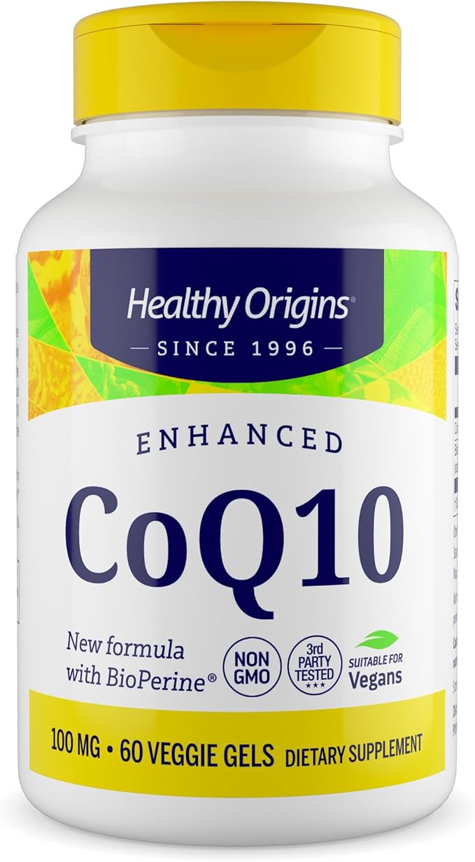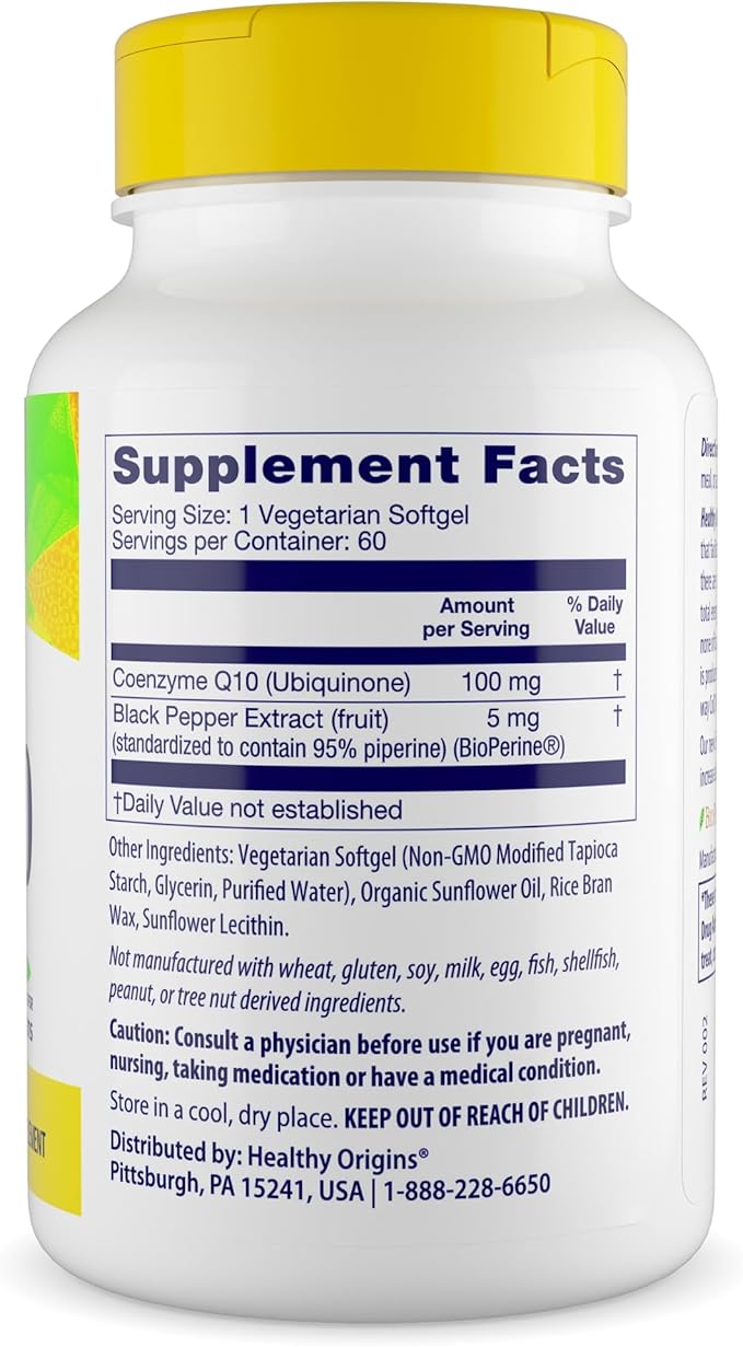 Healthy Origins Natural Enhanced CoQ10 (BioPerine®), 100 mg - Heart Health & Energy Supplement - Gluten-Free & Non-GMO Supplements, with BioPerine & Sunflower Lecithin ((Pack of 1) 60 Veggie Gels)