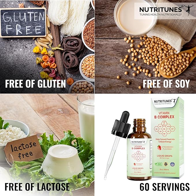 - COMPREHENSIVE B-COMPLEX SUPPORT: NUTRITUNES Liquid Vitamin B Complex drops delivers a potent blend of all B vitamins, including Vitamin B1 (as Thiamine HCL), Vitamin B2 (as Riboflavin 5 phosphate), Niacin( as Niacinamide), Vitamin B5( D-Pantothenic Acid), B-6 (as pyridoxine HCI), Vitamin B12 (as Methyl cobalamin), as Folate (5 -Methyltertrahydrofolate) and D-Biotin, to support energy production, healthy metabolism, and nervous system function.