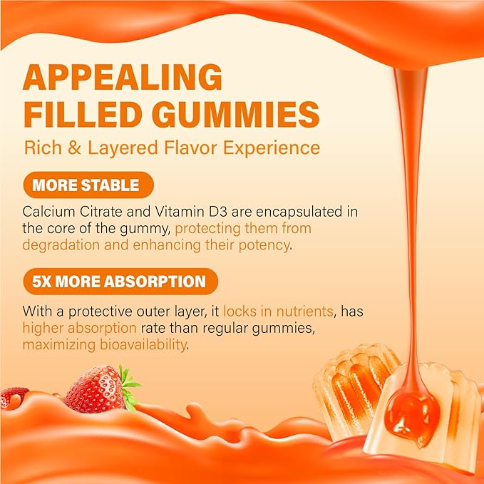 - INNOVATIVE FILLED GUMMIES: Our calcium supplements for women and men feature advanced filling technology, which separates the nutrients in the core and the outer layer. The inner layer encapsulates calcium citrate and D3, while the outer pectin layer protect them from degradation by light, heat and oxidative elements. This technology ensures that our gummies have 5X HIGHER ABSORPTION RATE than regular gummies, further improving bioavailability and helping the body effectively absorb nutrients.