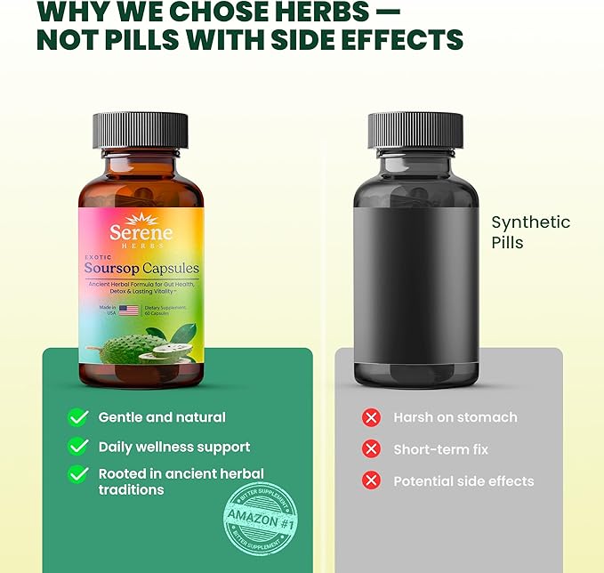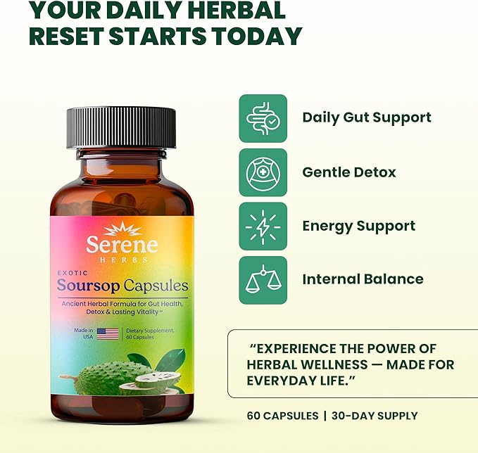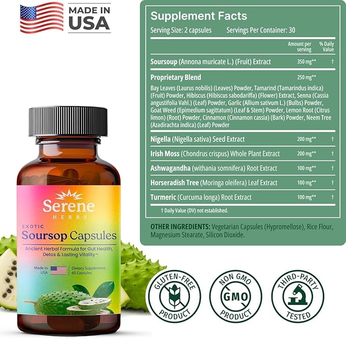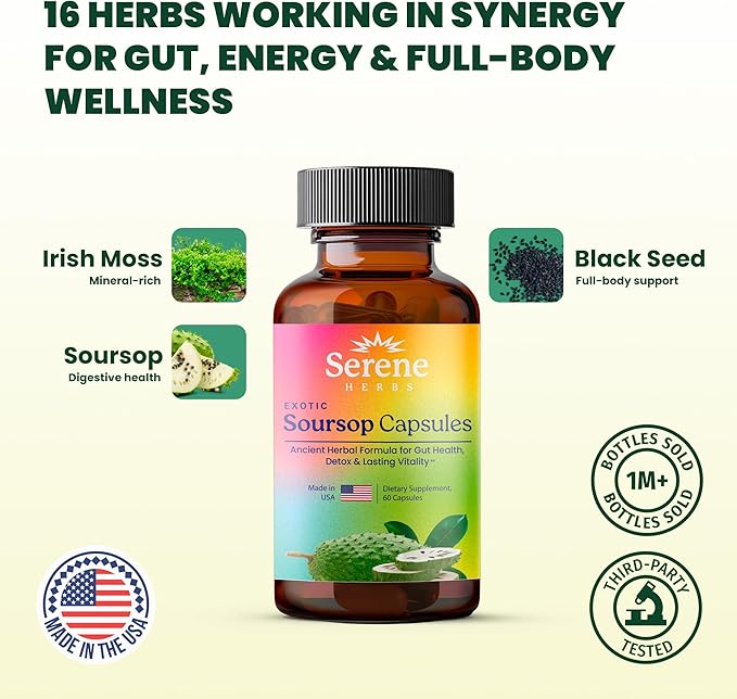 - POTENT SOURSOP EXTRACT: Each serving delivers 350mg of premium soursop (Annona muricata) fruit extract combined with black seed (Nigella sativa), Irish moss, moringa (horseradish tree), turmeric, ashwagandha, bay leaves, tamarind, hibiscus, senna, garlic, goat weed, lemon root, cinnamon, and neem tree. This potent herbal blend provides comprehensive antioxidant support, immune system benefits, and promotes daily wellness naturally.