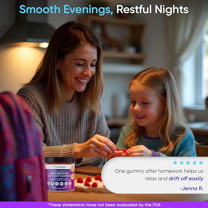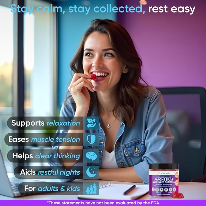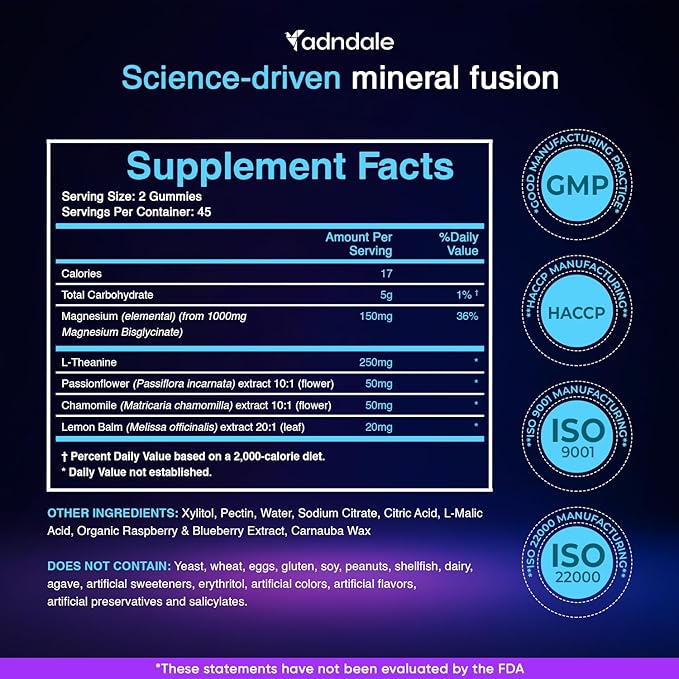 Adndale Magnesium Glycinate Gummies 90CT for Adults and Kids. 150 mg Chelated Mg with L-Theanine, Passionflower, Chamomile & Lemon Balm. Raspberry Flavor. Clear Thinking, Restful Nights, Muscle Ease