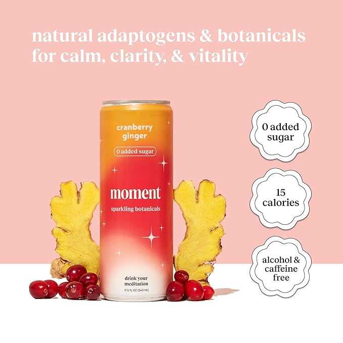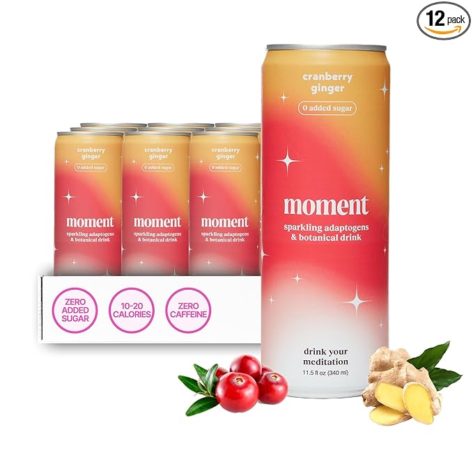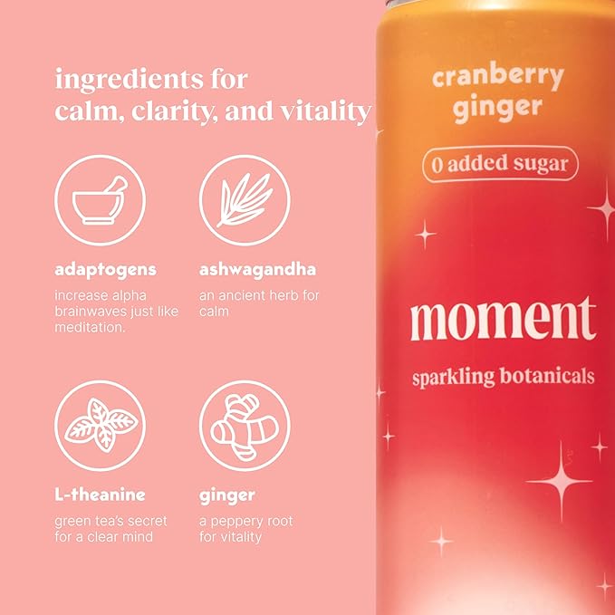 Moment Botanical Soda Soft Drink (Shark Tank) - SPARKLING Non Alcoholic Drinks | Cranberry Ginger | L-Theanine & Ashwagandha for Calm & Clarity | 0 Added Sugar 0 Caffeine | 12-pack
