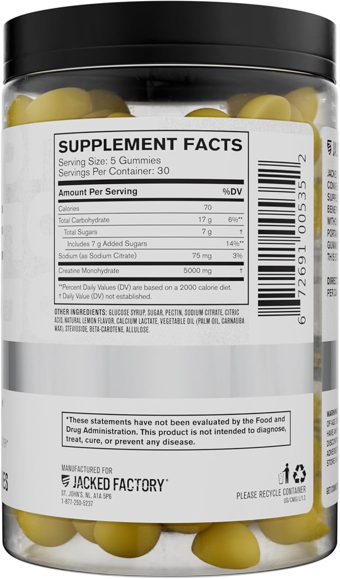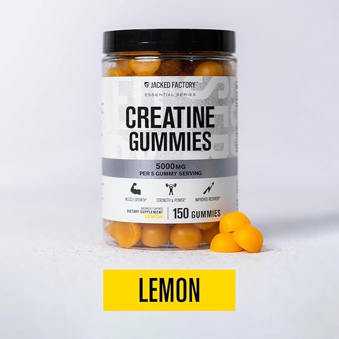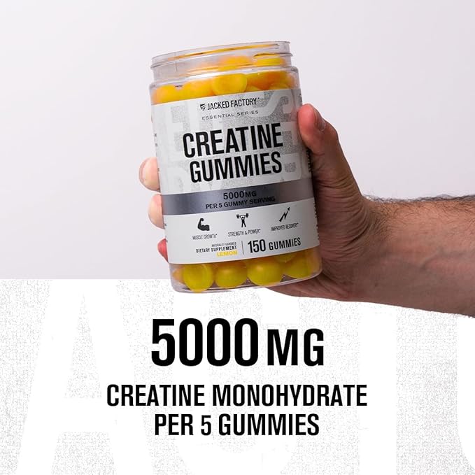 - Creatine Gummies for Active Men and Women: Designed for athletes, bodybuilders, fitness enthusiasts, and anyone looking to improve performance in the gym or on the field, Jacked Factory Creatine Monohydrate Gummies deliver 5,000 mg of pure creatine monohydrate in just 5 tasty, easy-to-chew gummies. Perfect for busy lifestyles, these convenient gummies can be used as a daily muscle-building supplement, making it easy to take your creatine anytime, anywhere - no shaker bottle required.