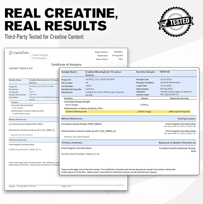 - High-Quality Creatine Gummies You Can Trust: Our gummies are third-party tested to deliver the full 5,000mg dose, ensuring you get the performance-enhancing benefits you need without compromise. Jacked Factory Creatine Gummies use a pectin base, making them vegan-friendly. Pairs well with protein powders, pre-workouts, and post-workout recovery drinks to create a complete training stack. Can be taken on an empty stomach or with a meal.