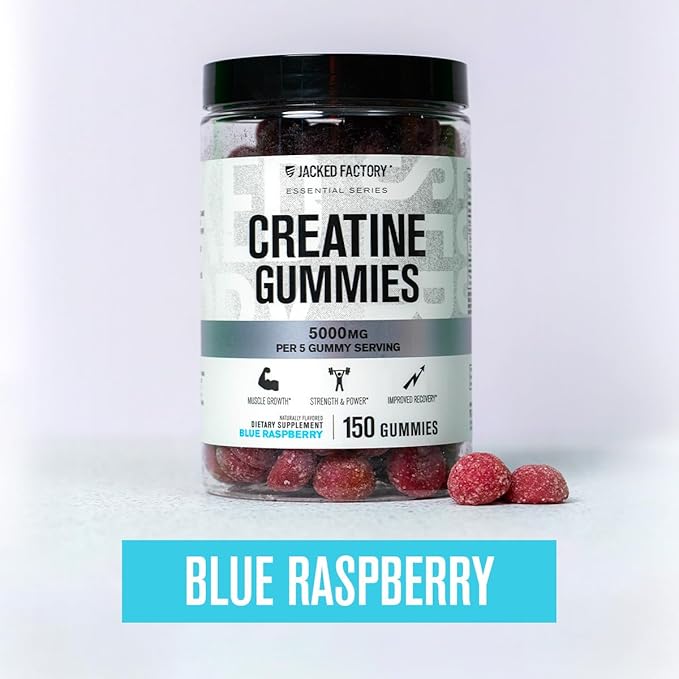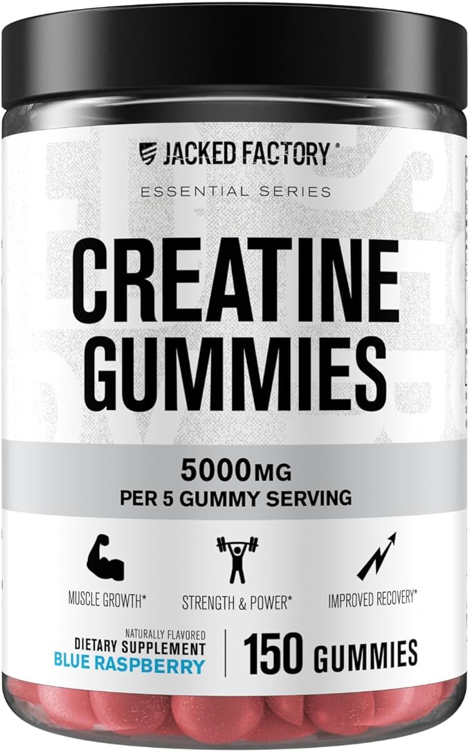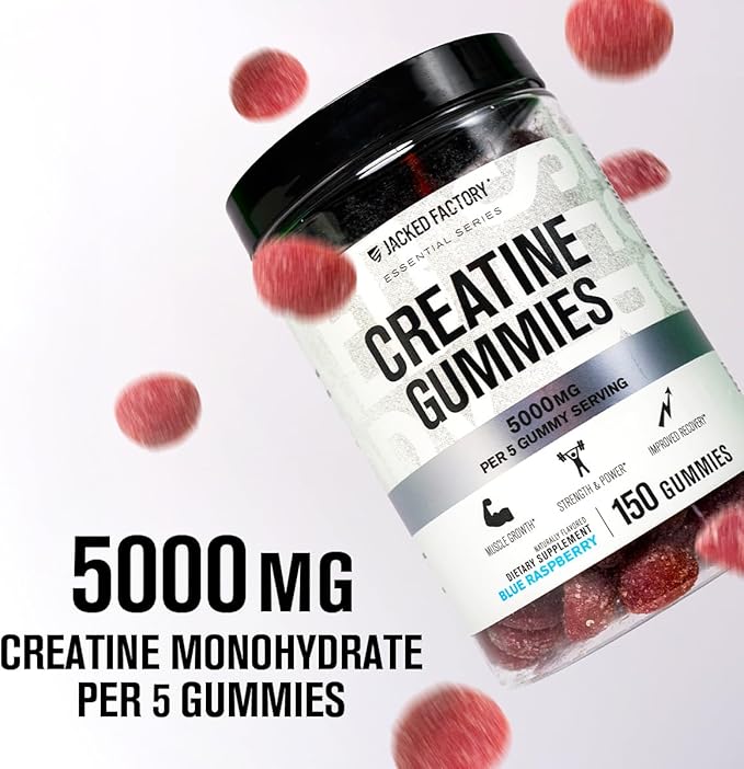 - Creatine Gummies for Active Men and Women: Designed for athletes, bodybuilders, fitness enthusiasts, and anyone looking to improve performance in the gym or on the field, Jacked Factory Creatine Monohydrate Gummies deliver 5,000 mg of pure creatine monohydrate in just 5 tasty, easy-to-chew gummies. Perfect for busy lifestyles, these convenient gummies can be used as a daily muscle-building supplement, making it easy to take your creatine anytime, anywhere - no shaker bottle required.