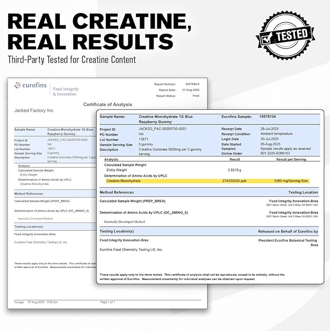 - High-Quality Creatine Gummies You Can Trust: Our gummies are third-party tested to deliver the full 5,000mg dose, ensuring you get the performance-enhancing benefits you need without compromise. Jacked Factory Creatine Gummies use a pectin base, making them vegan-friendly. Pairs well with protein powders, pre-workouts, and post-workout recovery drinks to create a complete training stack. Can be taken on an empty stomach or with a meal.