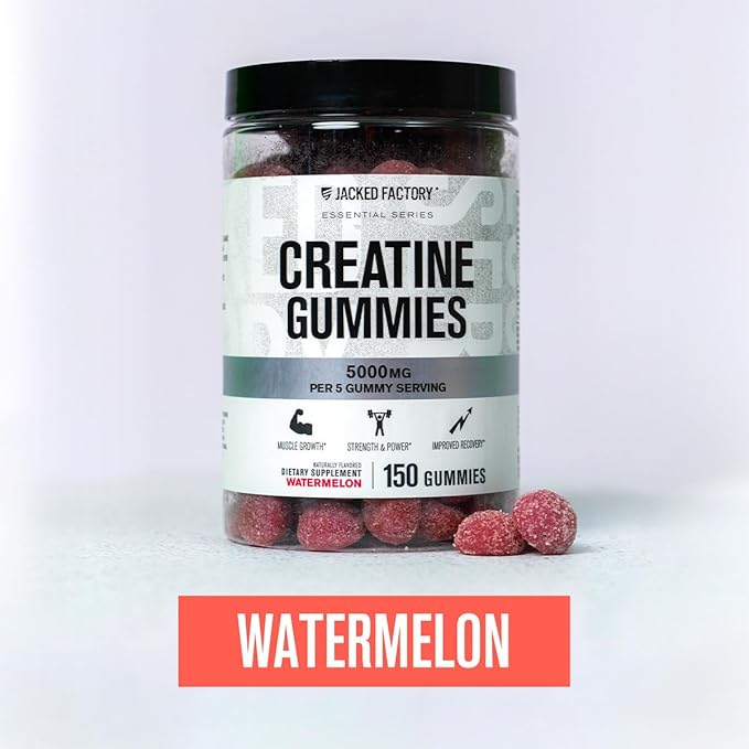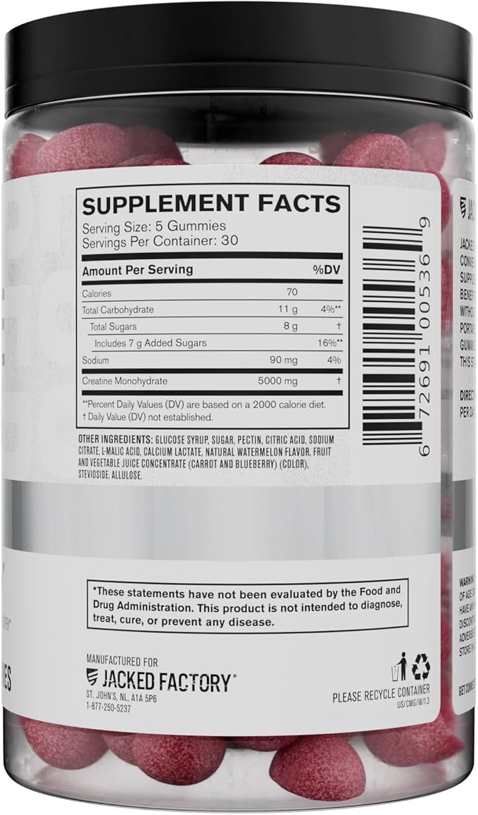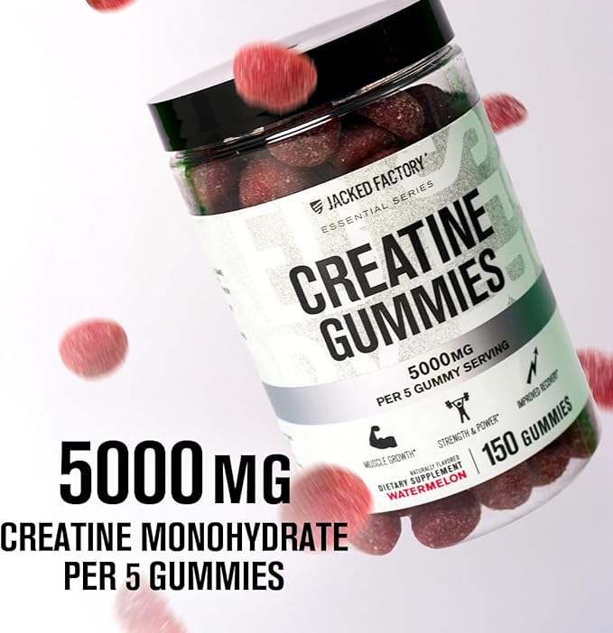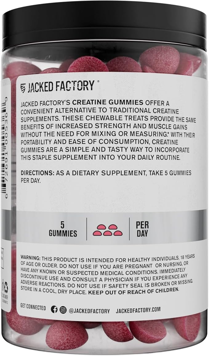 - Creatine Gummies for Active Men and Women: Designed for athletes, bodybuilders, fitness enthusiasts, and anyone looking to improve performance in the gym or on the field, Jacked Factory Creatine Monohydrate Gummies deliver 5,000 mg of pure creatine monohydrate in just 5 tasty, easy-to-chew gummies. Perfect for busy lifestyles, these convenient gummies can be used as a daily muscle-building supplement, making it easy to take your creatine anytime, anywhere - no shaker bottle required.