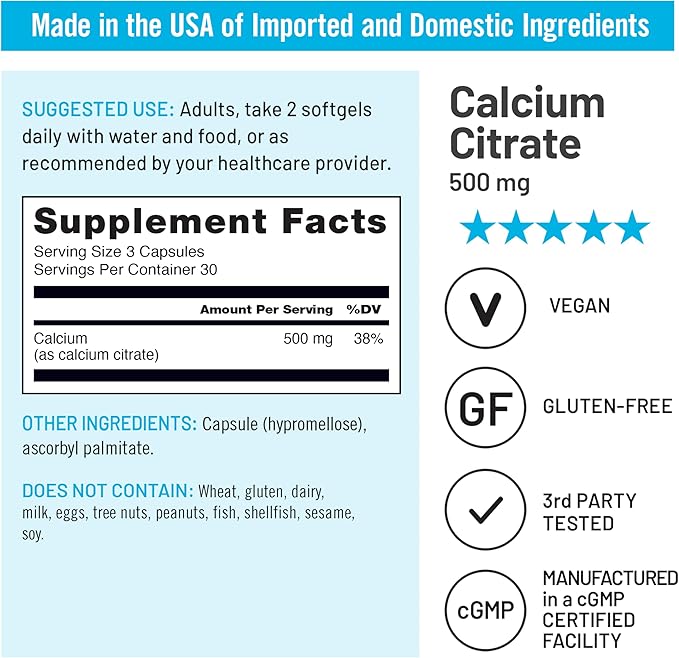 - VEGAN FORMULATION: Our Calcium Citrate is fully vegan to meet strict dietary restrictions, and does not contain harmful ingredients like magnesium stearate and titanium dioxide. It does not contain wheat, gluten, eggs, soy, dairy, milk, tree nuts, peanuts, fish, shellfish, or sesame seeds.