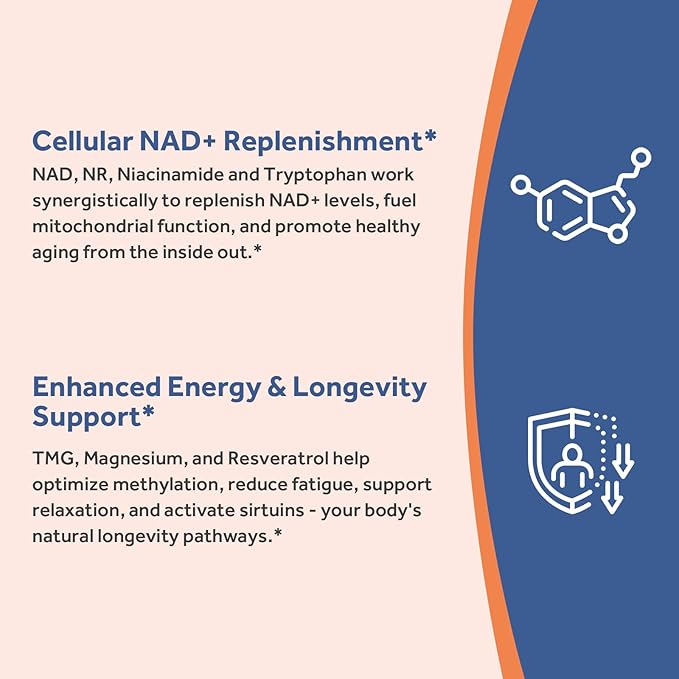 - Enhanced Energy & Longevity Support*: This next-gen NAD plus support complex combines TMG, magnesium glycinate & malate to promote healthy methylation and ease tension & fatigue, showing your brain and heart some love.* Bioavailable trans-resveratrol promotes antioxidant protection and optimizes the activity of sirtuins – key proteins linked to healthy aging and cellular defense.*