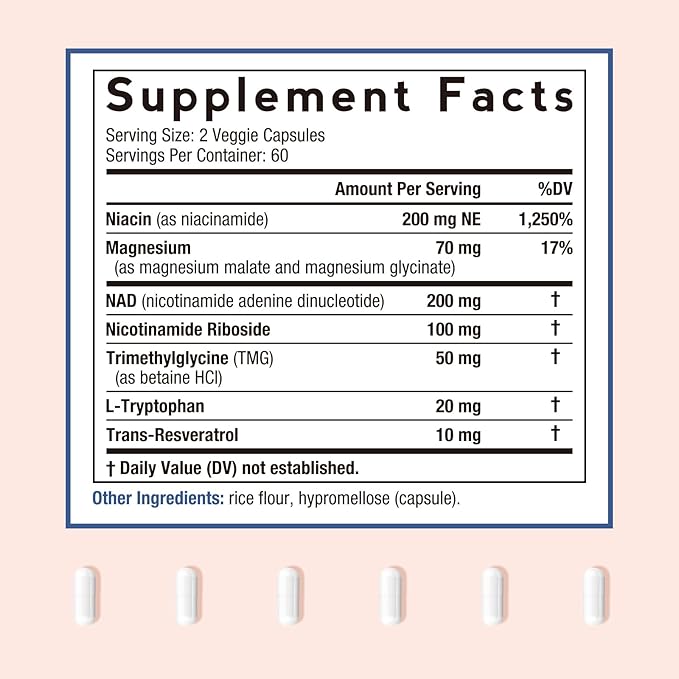 - Special Ingredients : Niacin, Magnesium, NAD, Nicotinamide Riboside, Trimethylglycine, L-Tryptophan, Trans-Resveratrol