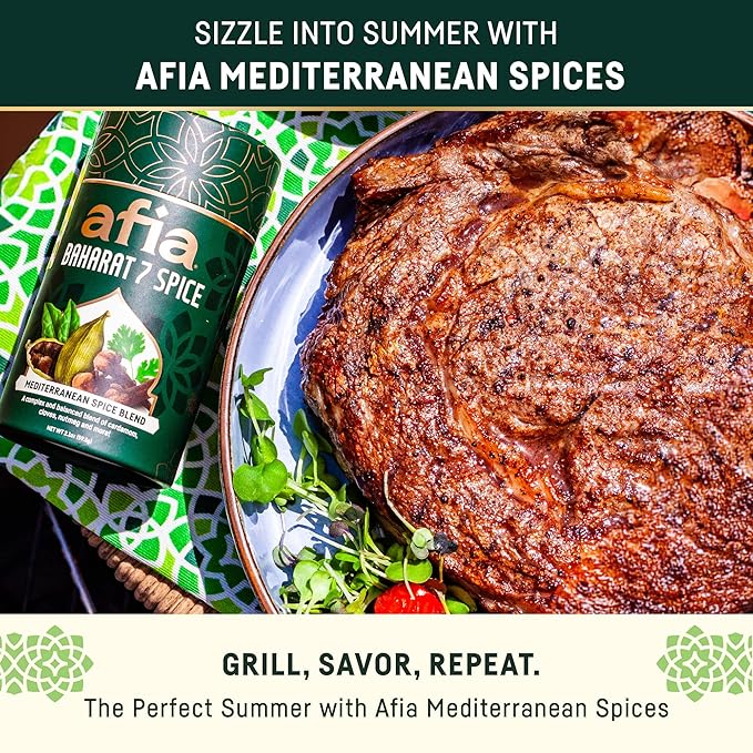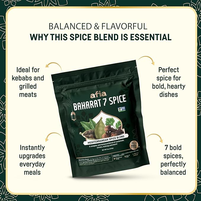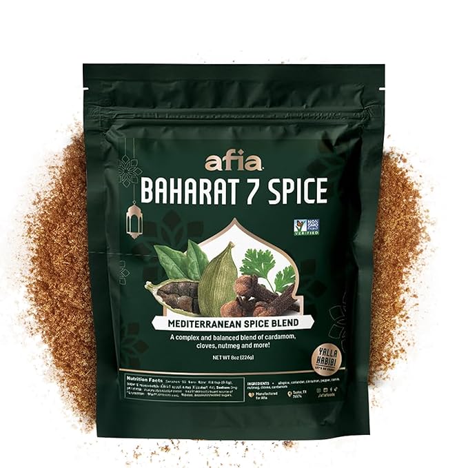 Afia Baharat 7 Spice Blend – Premium Levantine Seasoning with Coriander, Cinnamon, Cloves, Black Pepper, Cumin & Cardamom – Bold Middle Eastern & Mediterranean Flavor for Meats, Rice & Stews, 8 oz