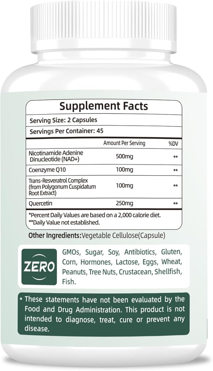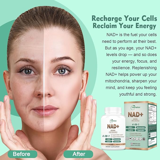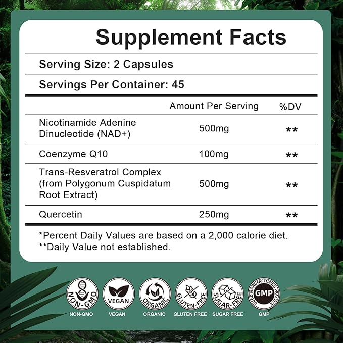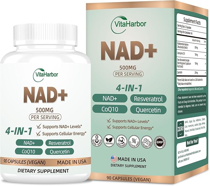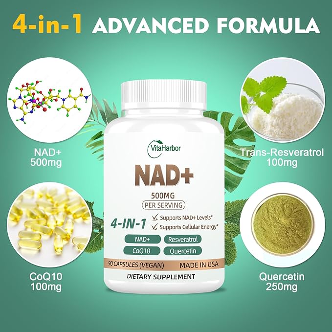 - 【4-in-1 Synergistic Formula】Our advanced 4-in-1 formula combines NAD+, Trans-Resveratrol, Coenzyme Q10 (CoQ10) and Quercetin to deliver a powerful wellness boost. Trans-Resveratrol, derived from Japanese Knotweed, is known for its potent antioxidant properties, while CoQ10 & Quercetin play key roles in cellular energy production. Together, these ingredients work synergistically to support cellular health and vitality.