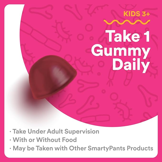 - DELICIOUS TASTE & KID-APPROVED: Grape Flavor with Other Natural Flavors. For children 3 years of age and older, take 1 gummy daily. May be taken with or without food. Chew each gummy thoroughly. May be taken as needed. May be paired with other SmartyPants formulas such as our kids multivitamins.