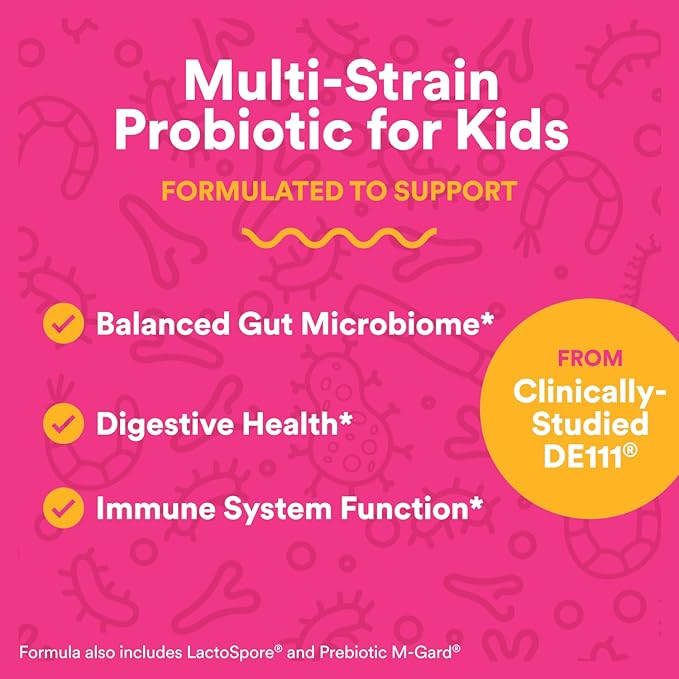 - TWO BILLION CFU PROBIOTICS TO SUPPORT A BALANCED GUT*: Backed by the latest scientific research, our probiotic formula includes two strains of spore-forming probiotics found in the environment (clinically-studied DE111 (B. subtilis)) to support your kid’s digestive health and immune system* and LactoSpore (B. coagulans).