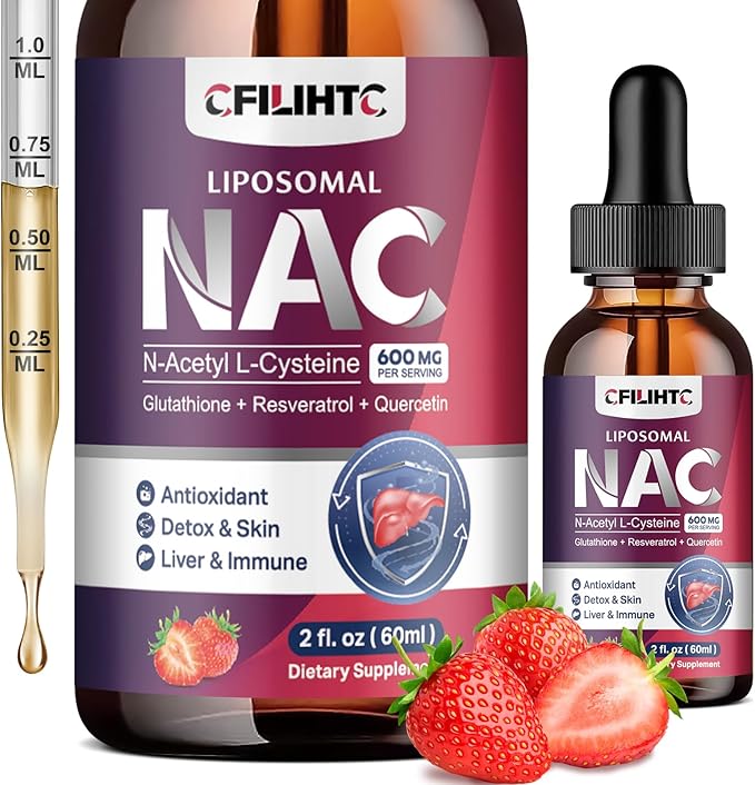 - Advanced Liposomal NAC Supplement: CFILIHTC NAC Supplement N-Acetyl Cysteine Liquid Drops delivers NAC 600mg per serving, combined with Glutathione, Resveratrol, Quercetin, Zinc, Vitamin C and Selenium to support antioxidant defense, liver detoxification, immune function, cellular health, and respiratory wellness. This comprehensive formula helps reduce oxidative stress, promote glutathione production and enhance overall vitality