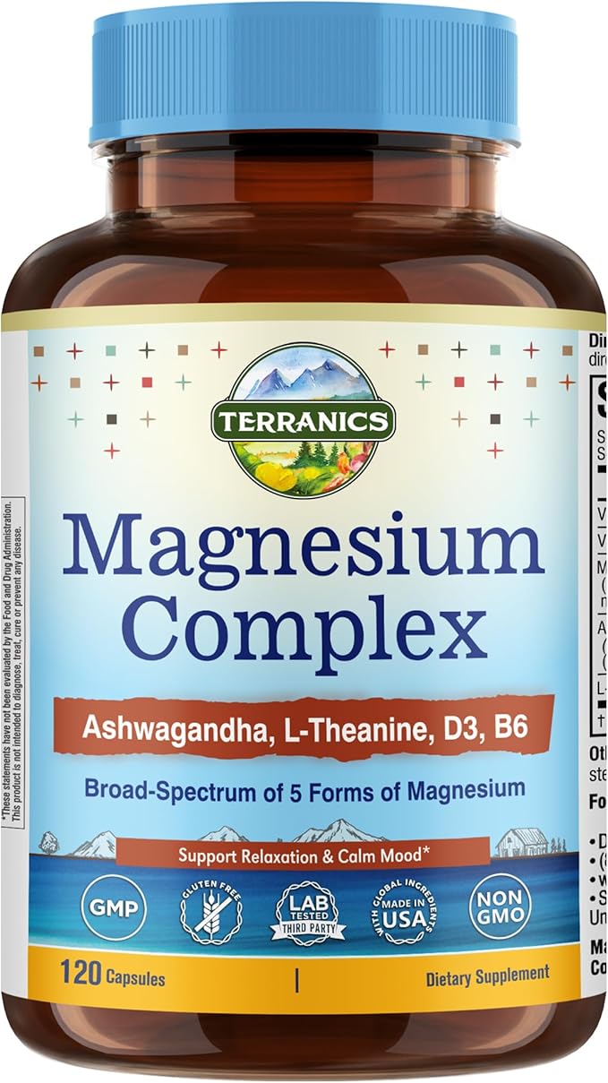 Terranics Magnesium Complex Supplement with Glycinate, Citrate, Taurate & Malate | Supports Nerve & Mood Health | Includes Ashwagandha, L-Theanine, Vitamin D3 & B6 | 120 Capsules | Non-GMO