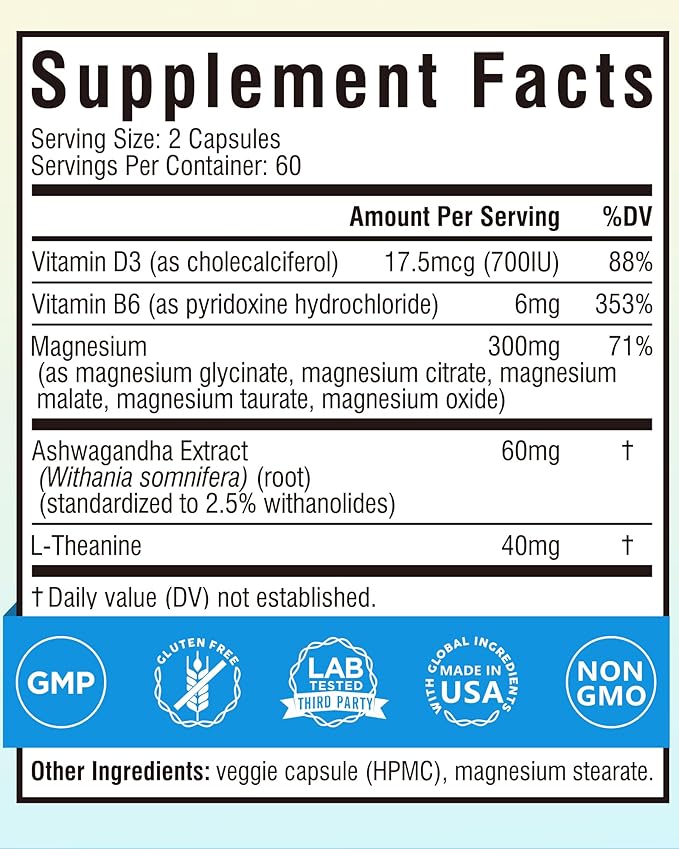 - Primary Supplement Type : Magnesium, VB6, VD3, Ashwagandha, L-theanine