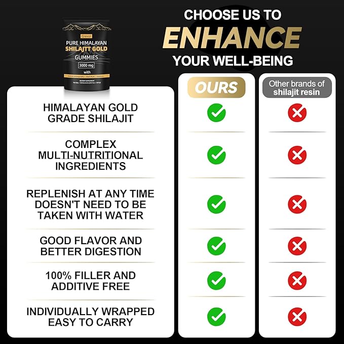 - GREAT-TASTING HASSLE-FREE OPTION: Shilajit Gummies have a better mouthfeel and are easy to be accepted, which is an extra advantage compared to the traditional shilajit resin, tablets and capsules. Its texture is soft and supple, making you indulge in pleasure every moment you savor it. Shilajit Gummies does not contain any artificial flavors, colors and gluten allergens and no added sugar. Non-sticky on the teeth, No getting stuck in the throat