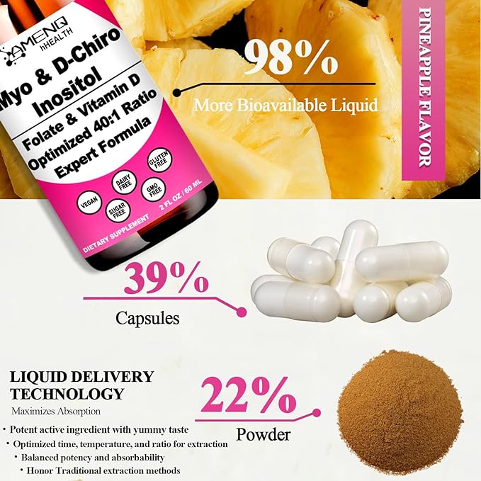 - → FOR MOST LIFESTYLES: Inositol supplements drops sugar free, tasty pineapple flavor, Non-GMO, Dairy Free, Gluten Free, Sugar Free. Inositol multivitamin for Women, Men, free of artificial fillers, flavors, preservatives, and additives. 30 servings of Myo-inositol & D-chiro inositol Supplement in each 2 fl oz (60 ML) bottle