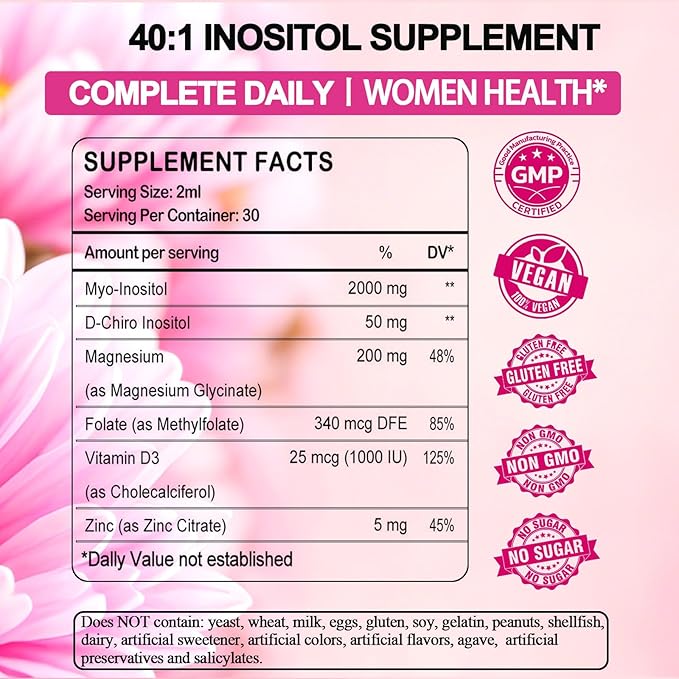 - → Optimal 40:1 Inositol Ratio: Transform your cycle with science-backed Inositol+! Featuring the body's optimal 40:1 ratio of 2000 mg myo-inositol and 50 mg d-chiro inositol, paired with vitamin D3 and bioactive folate, this breakthrough formula naturally maintain hormonal balance, support menstrual healthy, and promotes ovulation regularity—all while supporting reproductive wellness and radiant feminine balance*